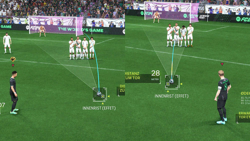Such as in duels. If “Advanced Defending” is activated, this requires good timing, which might be difficult for beginners. In the new control mode of the back line, players can manually decide by pressing two different buttons whether a shoulder bump or a “real” one-on-one manoeuvre is to be carried out. Although the attempts to win the ball are more effective than in FIFA 23, the ball always bounces back to the opponent. Even with supposedly successful timing – which could be a calculation on the part of the developer.