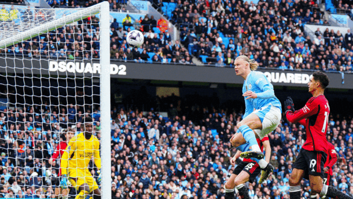 Това може би беше сцената на дербито на Манчестър, въпреки че не беше един от четирите гола. В 45-ата минута изключителният Фил Фодън – при резултат 0:1 – пресече с глава след перфектно изпълнена атака в петметровата зона – но Ерлинг Хааланд успя да направи подвиг, като от около два метра вдигна топката над празната врата с крак. Ако норвежецът просто беше вдигнал глава, Ман Сити вероятно щеше да изравни още преди почивката.