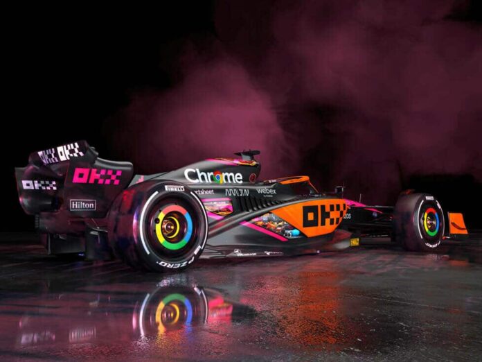 La librea está en la vanguardia de la campaña «Future Mode», que tiene como objetivo destacar la asociación de McLaren con su socio premium OKX, un intercambio de criptomonedas. Además de los coches, los trajes de carrera de Lando Norris y Daniel Ricciardo también llevarán el nuevo diseño.