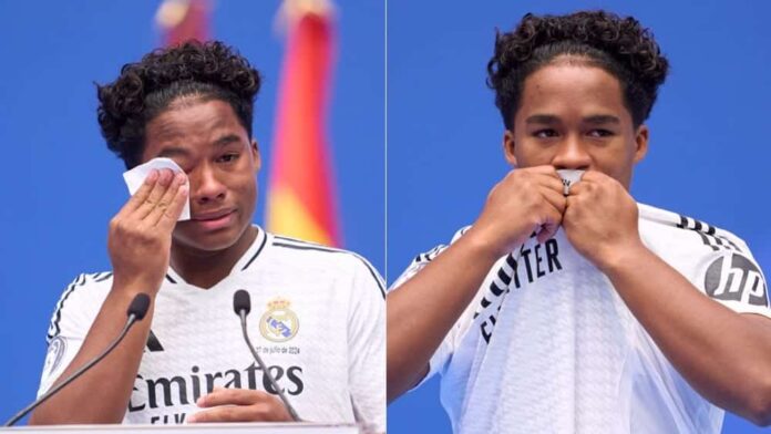 Vers minuit et demi, Endrick a finalement fait son apparition, sous un tonnerre d’applaudissements. Le jeune homme s’est adressé aux fans un peu plus tard, en espagnol. « Je suis très heureux, car je suis fan du Real Madrid depuis mon enfance », a déclaré Endrick, qui s’est laissé submerger par l’émotion et a laissé échapper quelques larmes. « Et maintenant, je suis là. C’est fou. Je ne trouve pas les mots pour décrire ce que je ressens en ce moment. J’ai toujours voulu être ici, merci beaucoup à tout le monde ici. Aujourd’hui, c’est un rêve absolu qui se réalise pour moi ».