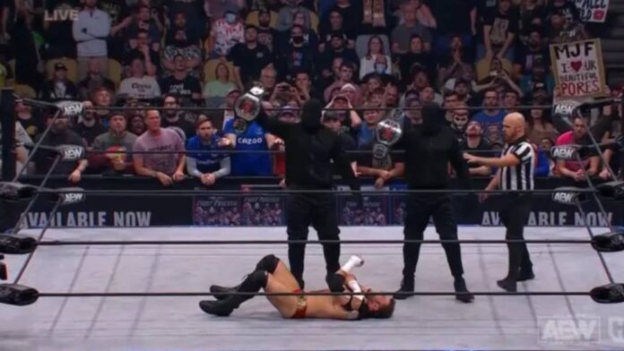 MJF had continued to defend the belts on his own in the absence of his injured partner and friend, this week MJF had actually gained his rival Samoa Joe as a replacement. Joe, however, left him in the lurch and alone against the masked men – after a supposed attack on Joe by the mysterious villains that turned out to be a plot.
