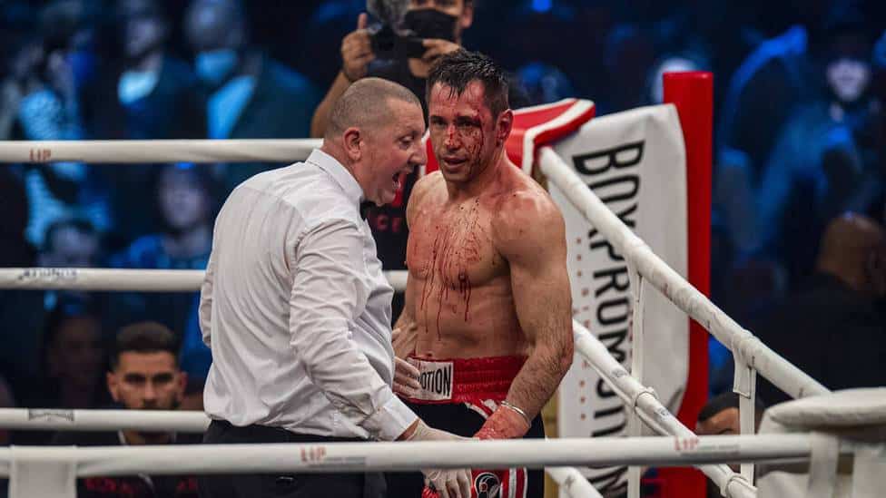 Storm heeft ook moeite met zijn snee in ronde vier. De man uit Leverkusen heeft bloed langs zijn oog lopen – dit zijn moeilijke omstandigheden.